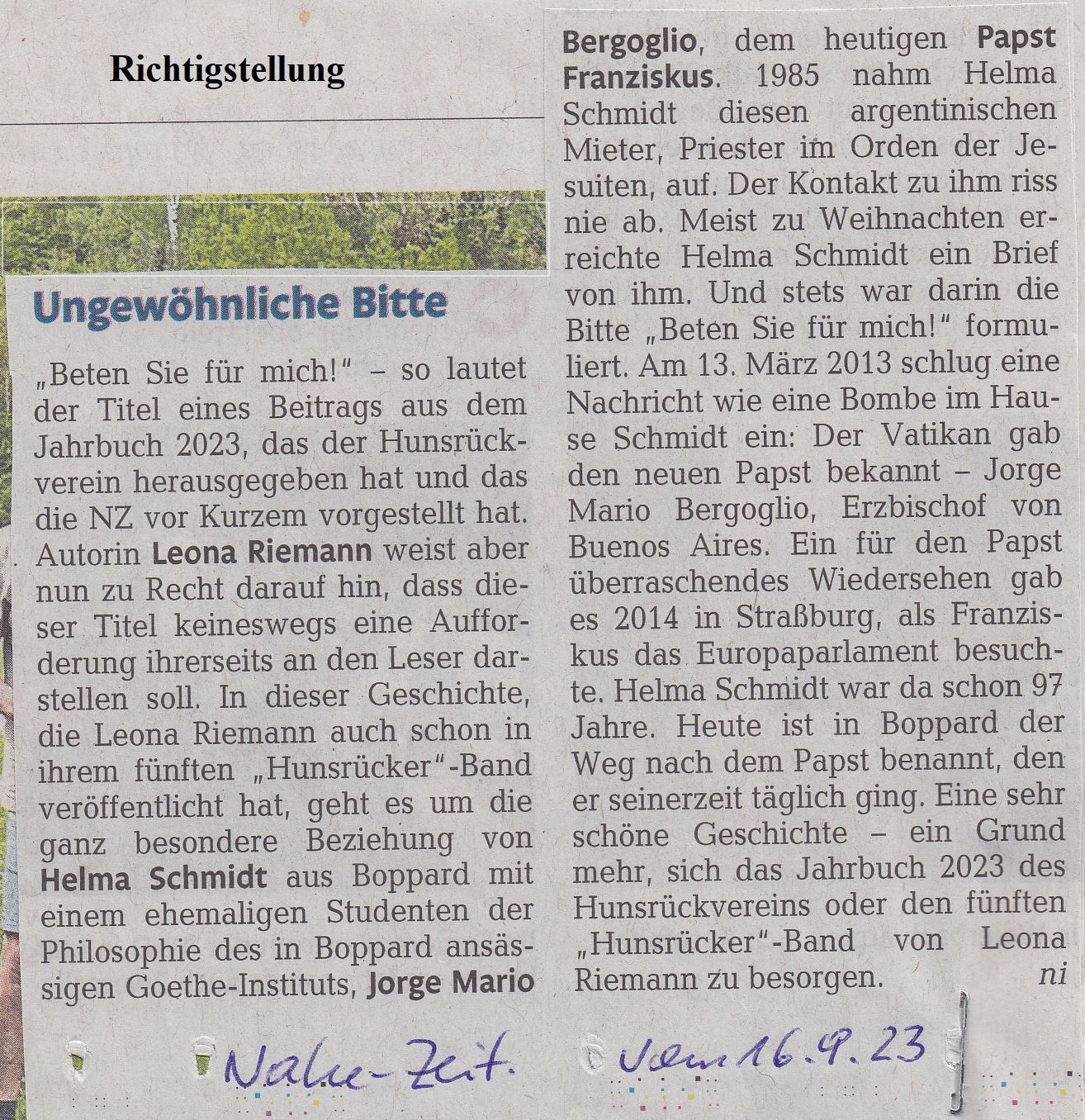 Eine besondere Richtigstellung las ich am 16. September in der Nahe-Zeitung und später auch in der RHZ. Autor ist Andreas Nitsch, Redakteur der NZ. Anlässlich der Besprechung des Jahrbuchs des "Hunsrück-Vereins e.V." hatte er sich vertan und den Titel der veröffentlichten Erzählung "Beten Sie für mich!" mir in den Mund gelegt:
