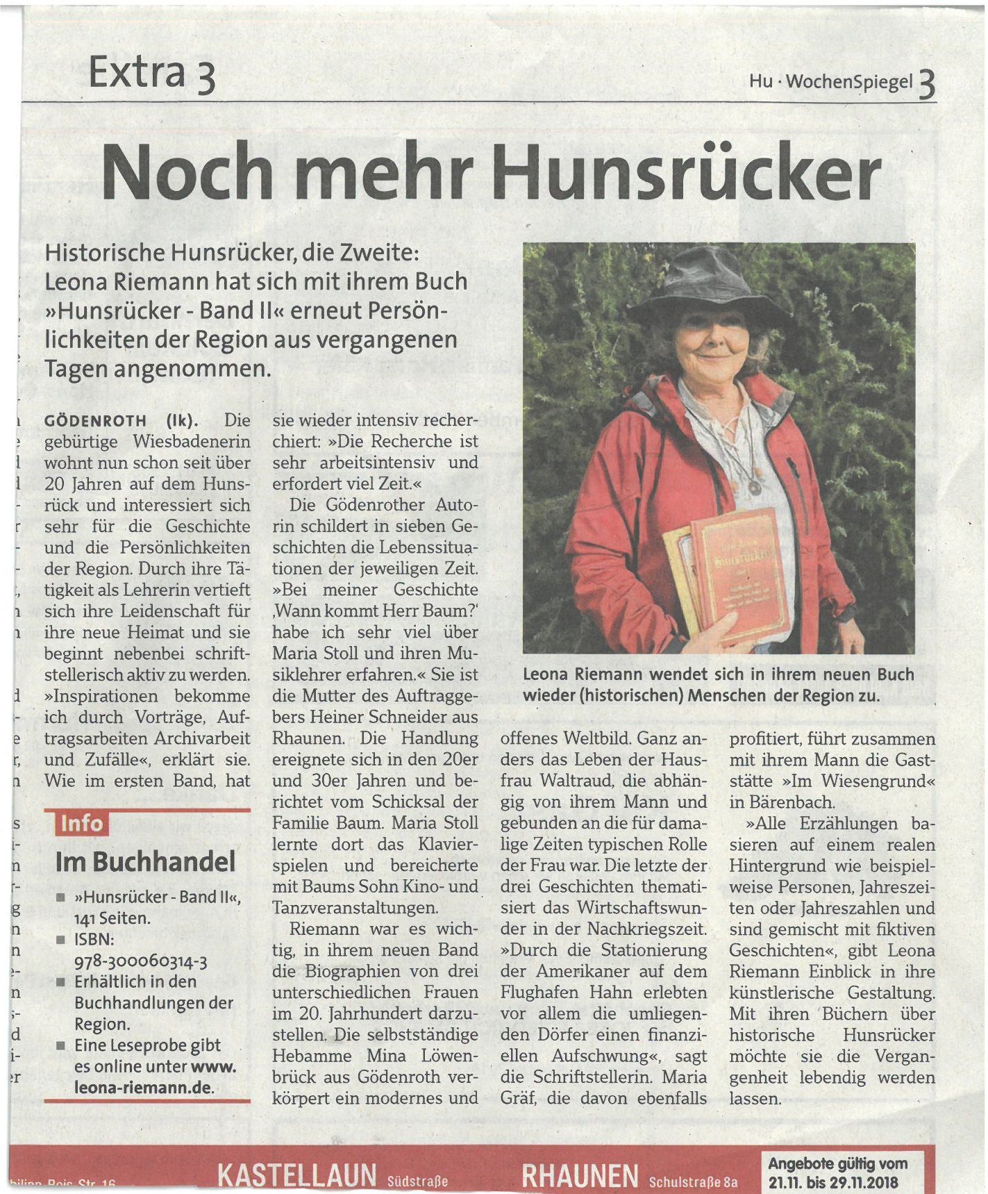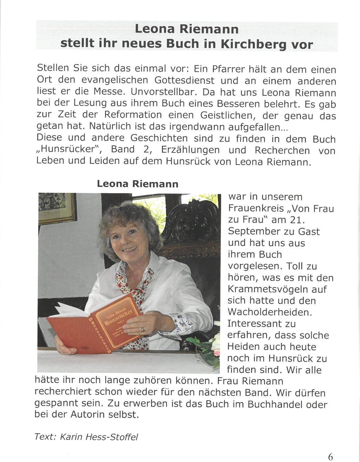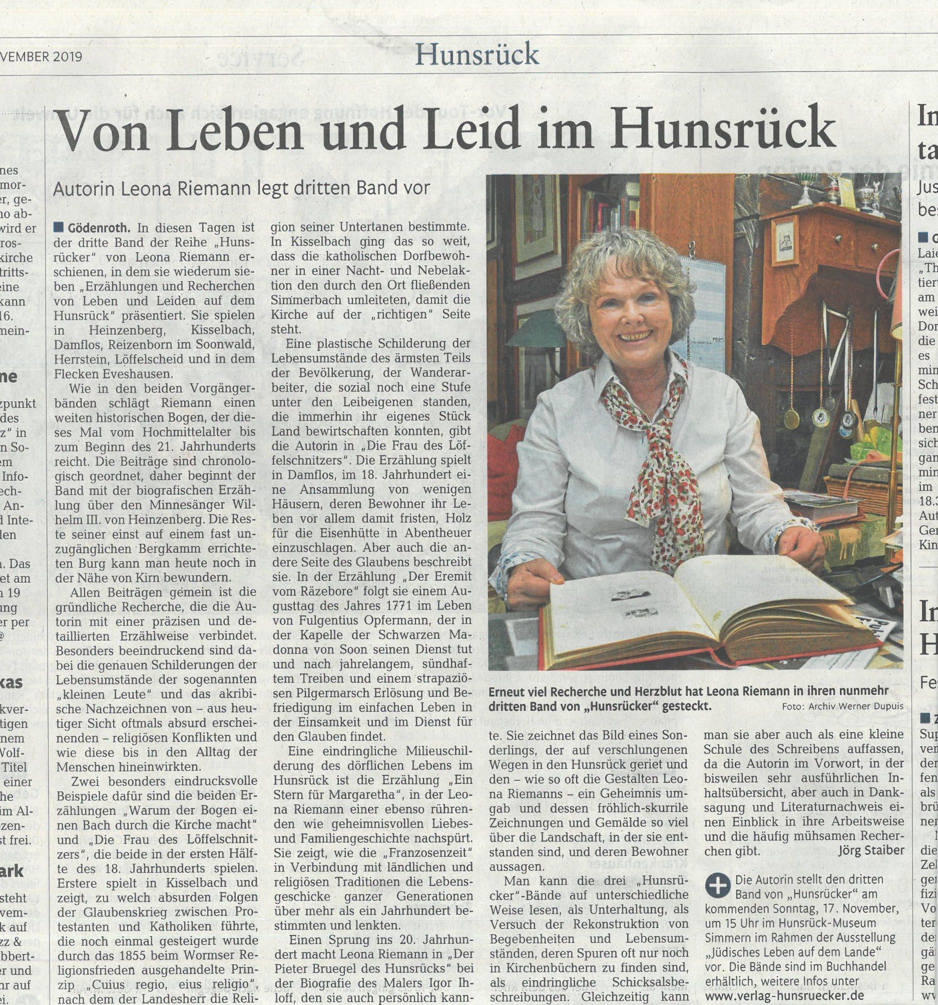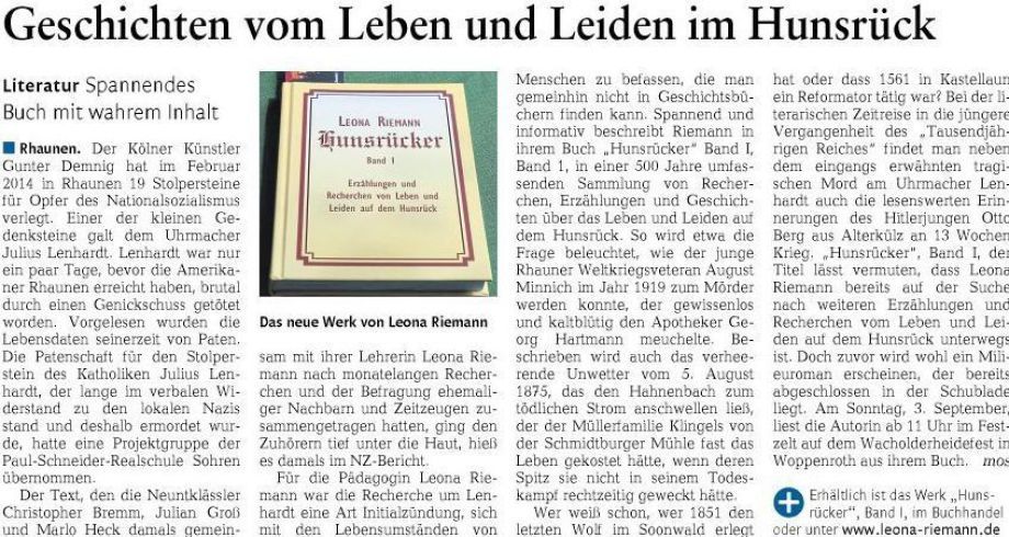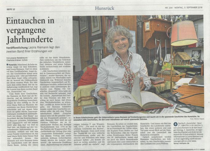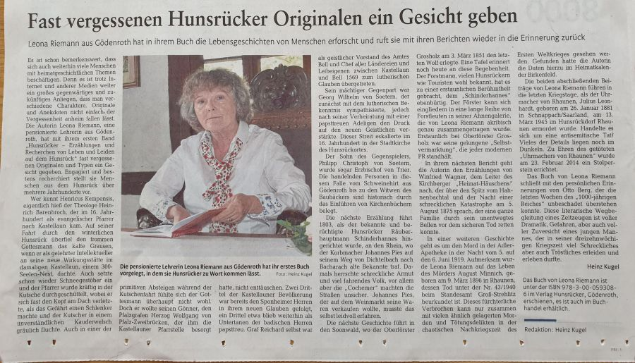 "Drei "Hunsrücker"-Bände hat die in Gödenroth lebende Autorin Leona Riemann verfasst. Sie verfolgt darin mit großer Akribie in der Zeitspane vom Mittelalter bis in unsere Tage das Schicksal von Menschen der unterschiedlichsten sozia-len Schichten vom Tagelöhner über den in bescheidenem Wohlstand lebenden Bauern oder Handwerker bis hin zum Burgherrn, Künstler oder Eremiten. Stilistisch bedient sie sich bei den jeweils sieben Beiträgen pro Band der verschie-densten Genres von der Erzählung über die Recherche bis hin zur Biografie, immer eng an tatsächlichen Geschehnissen orientiert. " jst