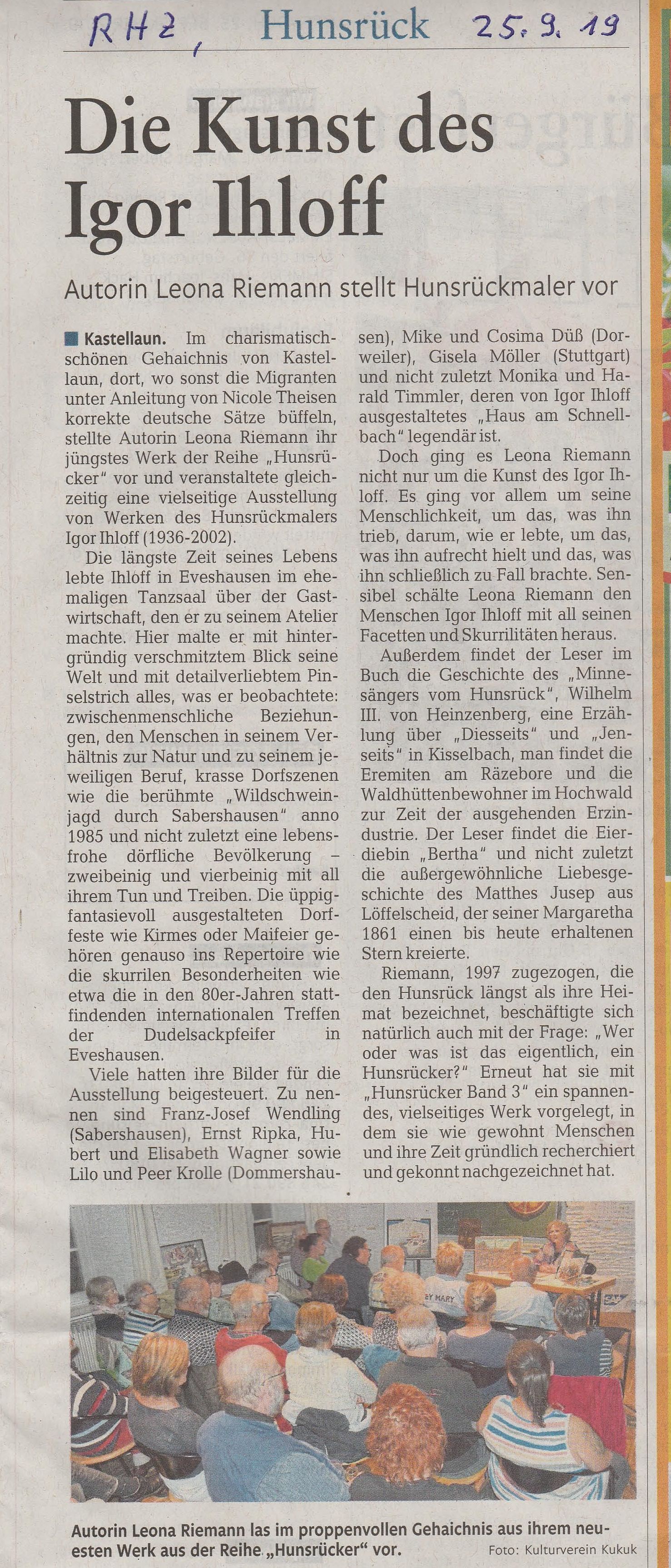 "Doch ging es Leona Riemann nicht nur um die Kunst des Igor Ihloff. Es ging ihr vor allem um seine Mnschlichkeit, um das, was ihn trieb, darum, wie er lebte um das, was ihn aufrecht erhielt und das, was ihn schließlich zu Fall brachte. Sensibel schälte Leona Rieann den Menschen Igor Ihloff nit all seinen Facetten und Skurrilitäten heraus."
