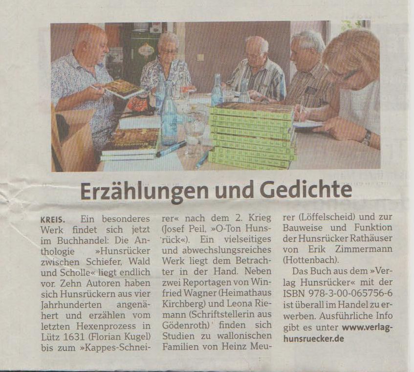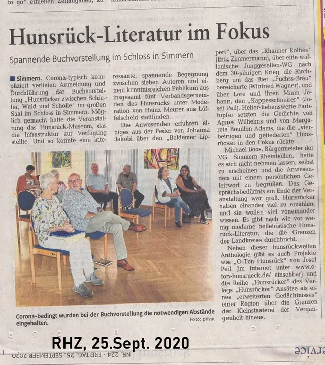 Gekommen waren Winfried Wagner (Kirchberg), Erik Zimmermann (Hottenbach), Margaretha Bouillon-Adams (Damflos), Heinz Meurer (Löffelscheid), Agnes Wilhelms (Peterswald), Josef Peil (Mastershausen) und Leona Riemann (Gödenroth). Michael Boos, Verbandsgemeinde-Bürgermeister Simmern-Rheinböllen, übernahm persönlich die Begrüßung der Anwesenden. Nebenstehender Artikel von Heinz Meurer wurde in den verschiedenen Regional-ausgaben der Rheinzeitung in der Zeit vom 25. bis 28. September veröffentlicht.